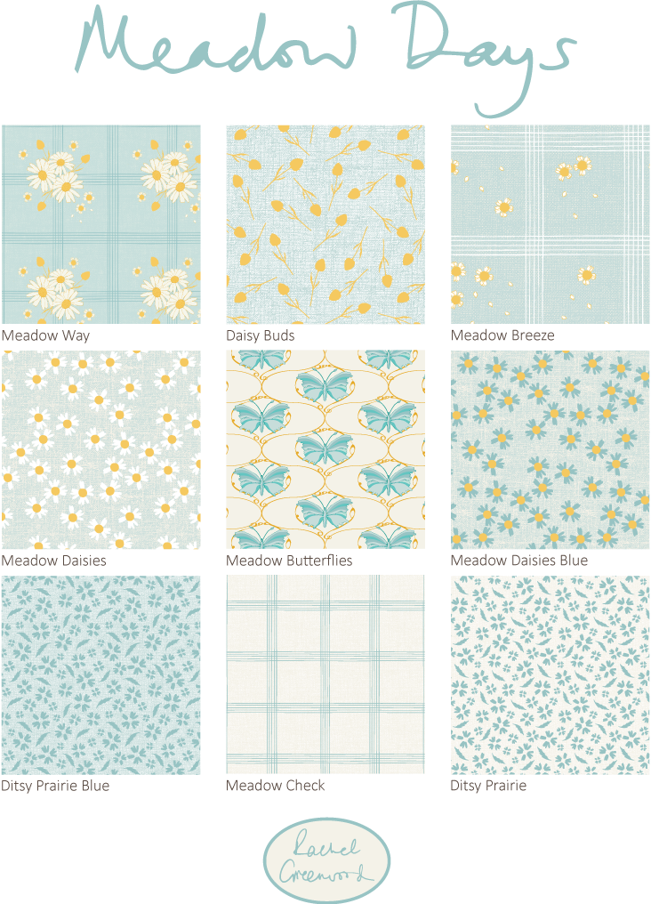 Meadow Days is my brand new collection inspired by early summer days in the countryside. With a sun-washed palette and hand drawn, meadow motifs with a vintage feel, these designs will add warmth, freshness and pretty detail to any home or sewing project.